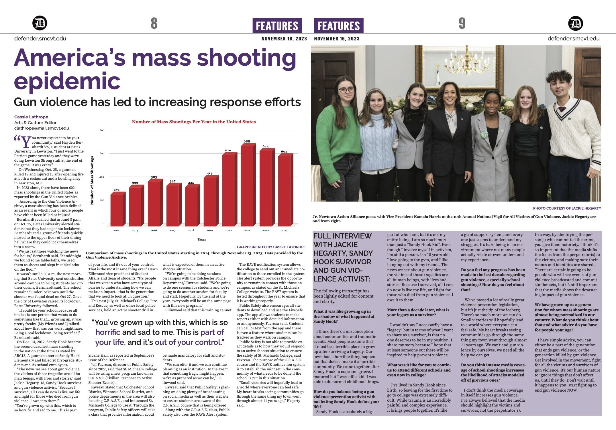The article addresses the ongoing school shooting epidemic in America, brought into sharp focus by a recent tragic shooting at Bates University in Lewiston, Maine. It features interviews with a former student, now an activist for gun control from Sandy Hook Elementary School, who share their emotional perspectives on the recurring violence and the trauma that follows each new incident. The article also includes discussions with Saint Michael's College officers about the safety policies the school has in place to prevent and respond to potential threats. The piece underscores the growing fear among students and staff across the country and the urgent need for more comprehensive solutions.